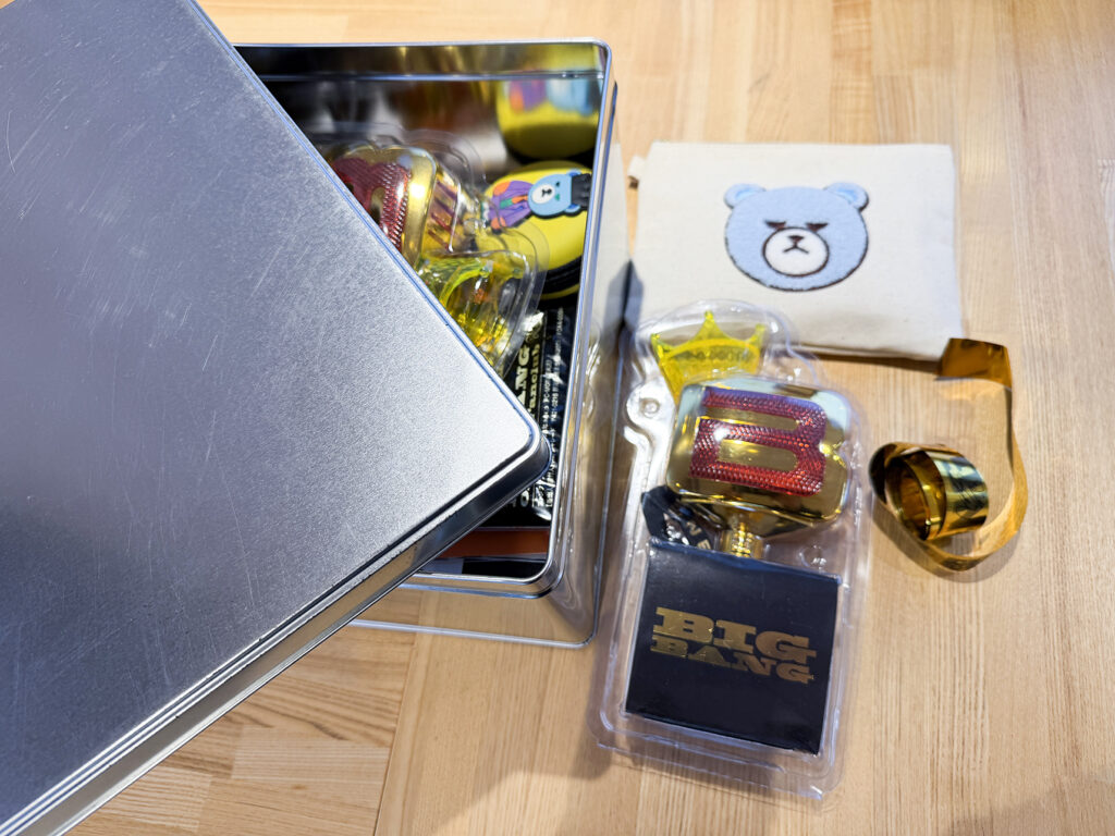 韓国の音楽グループ「BIGBANG」のグッズがたくさん詰まった缶です。2015年か2016年頃、めざましテレビでデビュー当時の姿を見て「かっこいい!」と思ったのがきっかけで好きになりました。当時はまだ韓流ファンと言いづらい雰囲気もあり、最初はこっそりCDを聴いていましたが、彼らが売れるようになってからは公に応援できるようになり、ファンクラブにも3、4年ほど入っていました。 缶の中には、大切にプラスチックケースに戻して毎回使っていたペンライトをはじめ、ライブ限定のブレスレットやテープ、ファンクラブのステッカー、大阪・鶴橋のコリアンタウンまで行って買ったグッズなどが入っています。ローソンをハシゴして集めた一番くじの景品や、音楽が聴ける缶バッジなど、本当に色々なものが詰まっていますね。